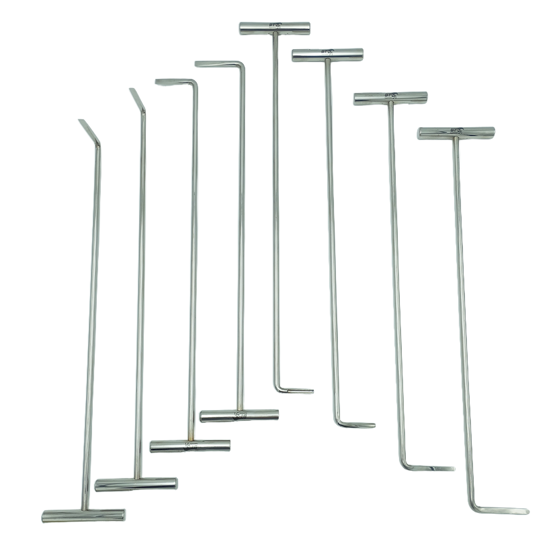 Das Set der Dentalhebel besteht aus acht Instrumenten mit unterschiedlichen Formen, Längen und Breiten. Die Hebel werden nach dem Einsatz von Periotomen verwendet.