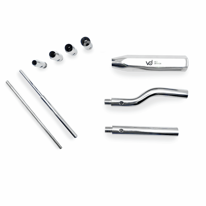Das Wolfzahn-Extraktionsbesteck besteht aus 4 geschlossenen Aufsätzen (6/8/10/12 mm), einem Handgriff, einer gebogenen Verlängerung, einer geraden Verlängerung, 2 Stifte für die Auswechselung und einer Instrumententasche. – Art.-Nr.: STO_KBF