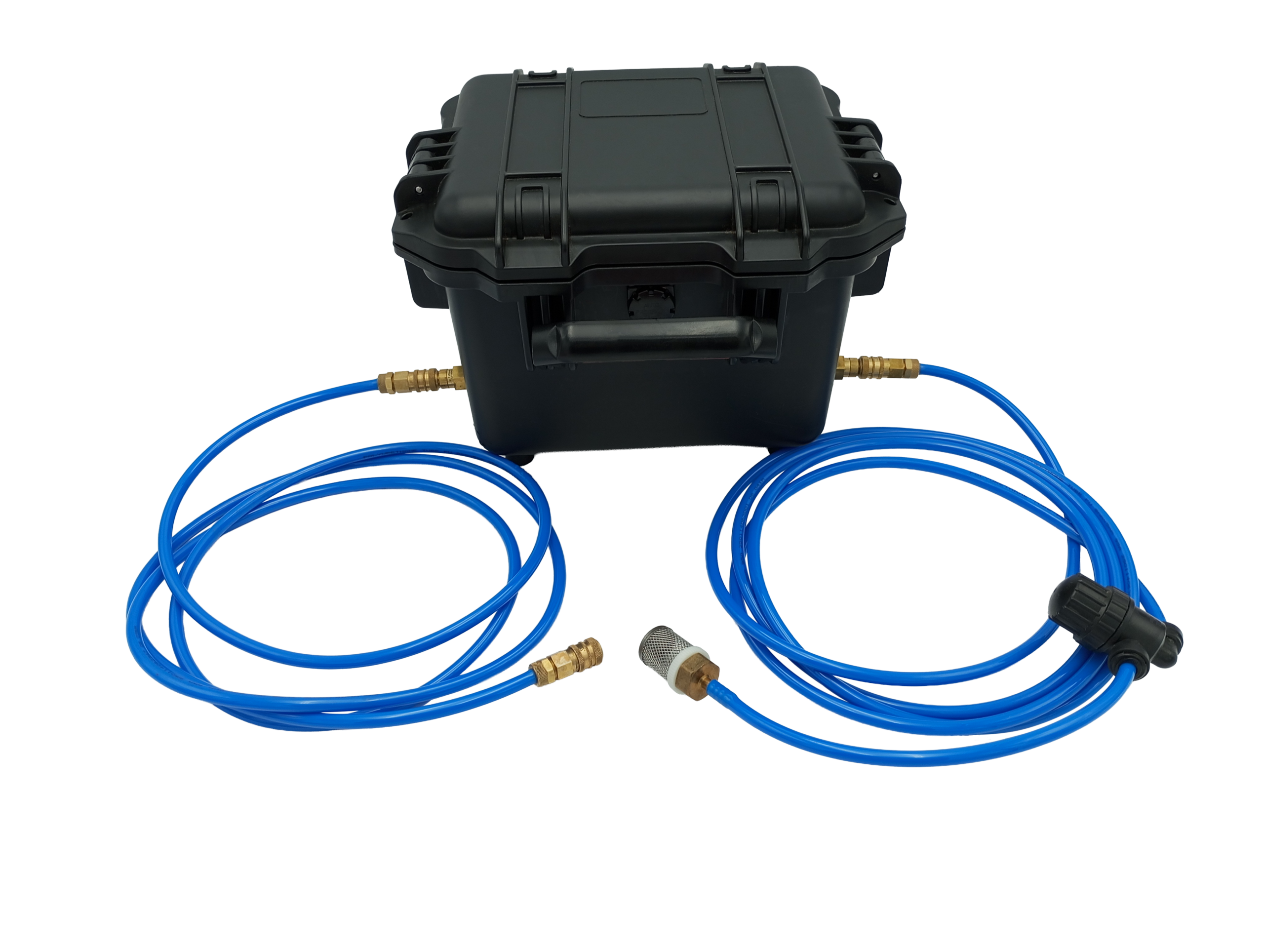 Die integrierte Blei-Säure-Batterie ermöglicht einen autonomen Betrieb ohne Steckdose. Ein Ansaugschlauch mit Filter und Sieb schützt die Pumpe zuverlässig vor Schmutzpartikeln und trägt zu einer langen Lebensdauer des Systems bei.